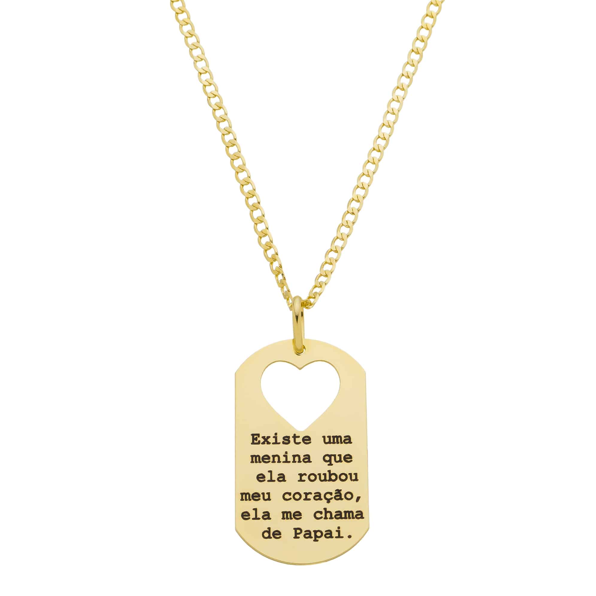 O pingente recebe a gravação de uma frase escolhida pelo cliente, permitindo transformar sentimentos em uma peça única e inesquecível. O detalhe vazado em formato de coração traz ainda mais charme e emoção ao colar.