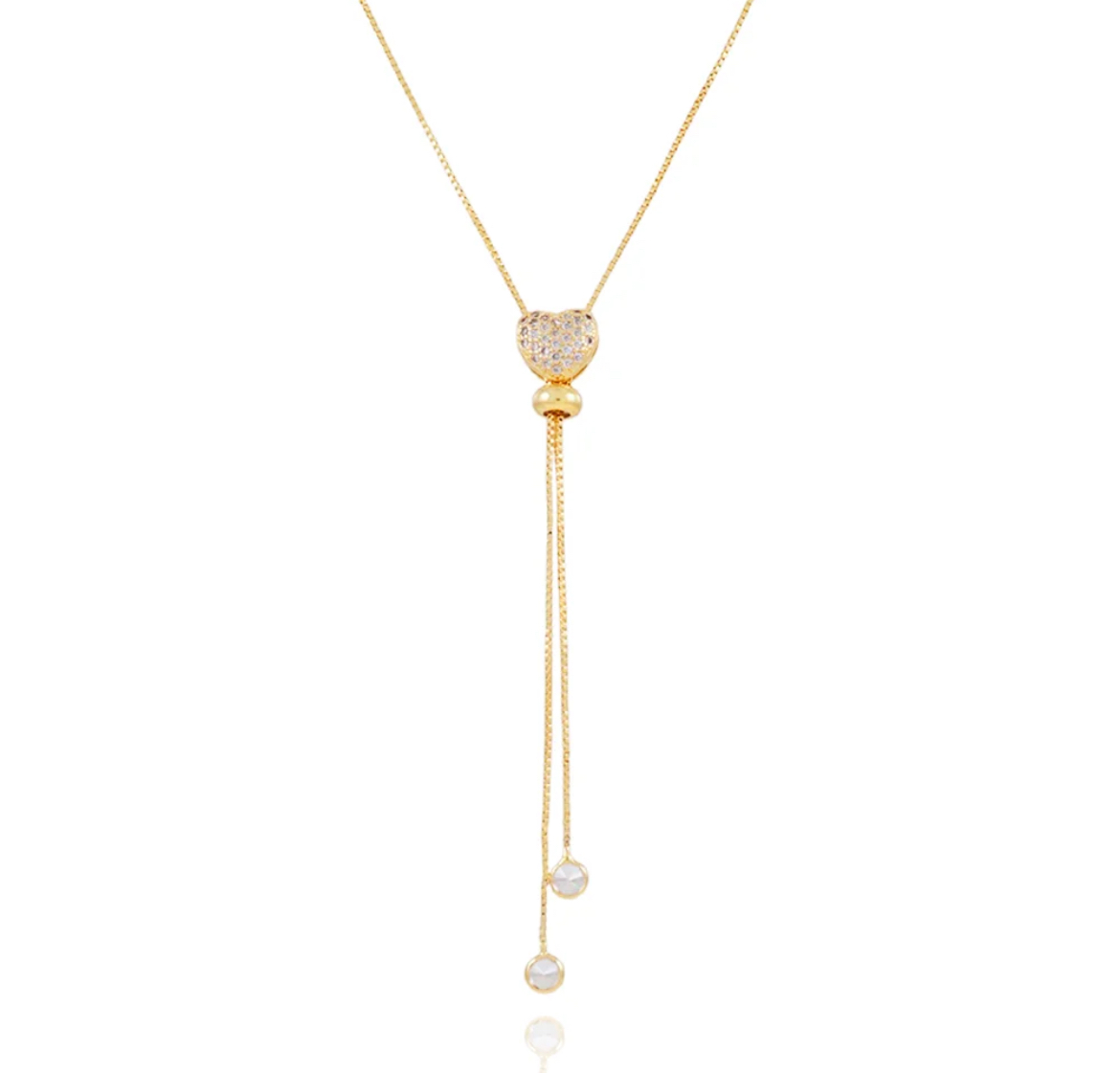 Colar Gravatinha de Coração Cristal • Banhado a Ouro 18k