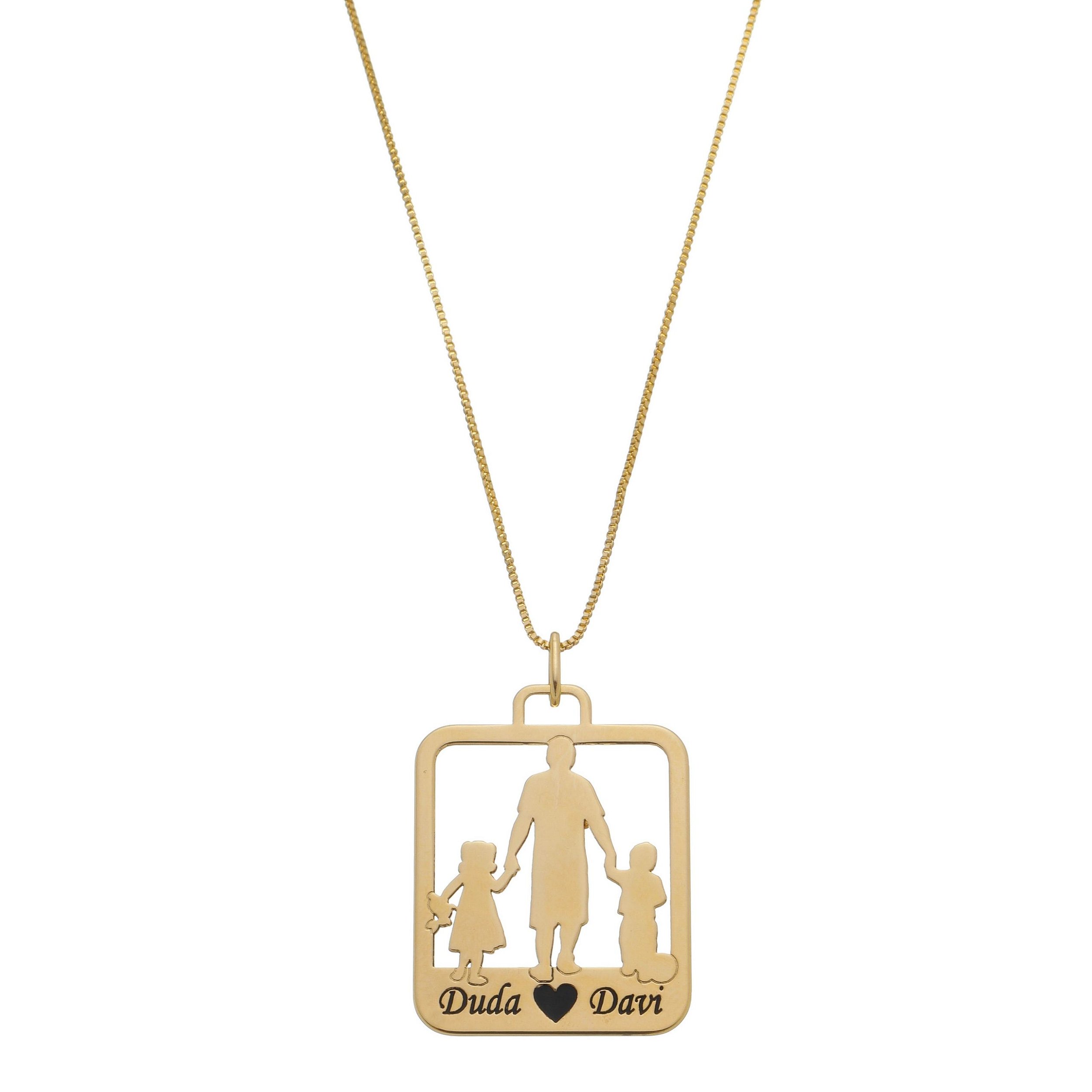 O pingente apresenta a silhueta vazada de um pai com duas crianças, simbolizando cuidado, presença e amor incondicional. Na parte inferior, o colar recebe a gravação dos nomes, tornando a peça única e pessoal.