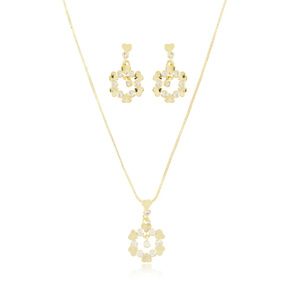Este lindo conjunto CRAVEJADO DE ZIRCÔNIAS CRISTAL é feito com LATÃO BANHADO A OURO 18K de alta qualidade.