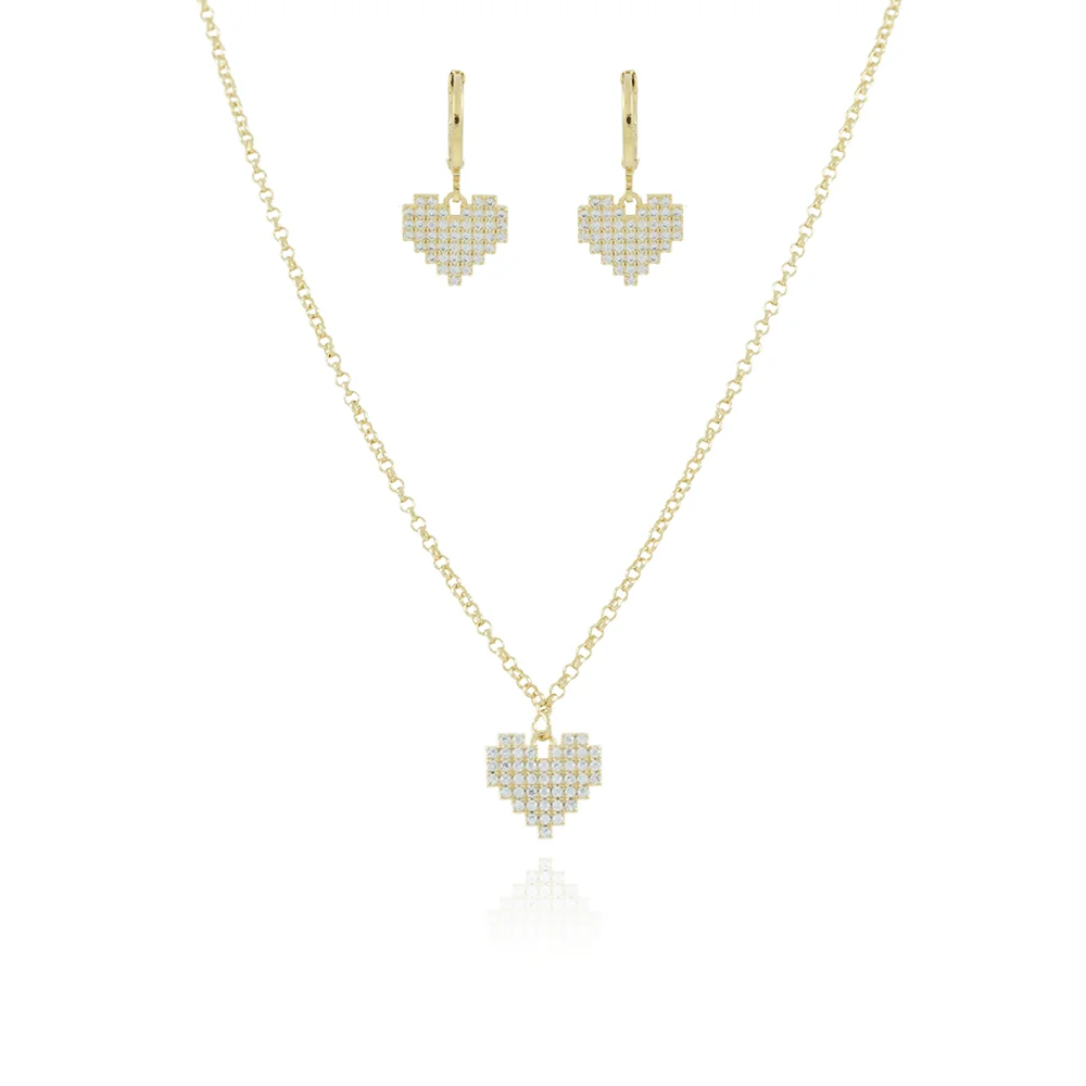 Este lindo conjunto DE CORAÇÃO CRAVEJADO DE ZIRCÔNIAS CRISTAIS é feito com LATÃO BANHADO A OURO 18K de alta qualidade.