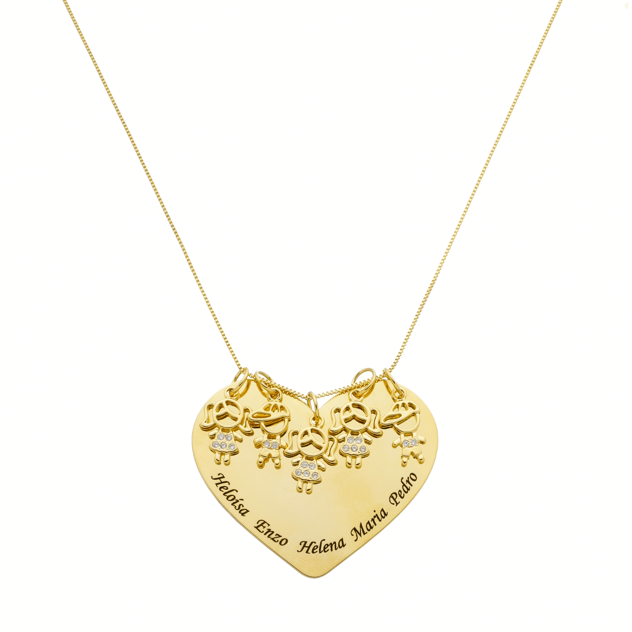 O pingente em formato de coração recebe a gravação de cinco nomes, acompanhado por um delicado boneco ou boneca em relevo, com aplicação de pedras, trazendo charme, emoção e sofisticação à peça. Uma escolha perfeita para simbolizar filhos, netos ou pessoas inesquecíveis.