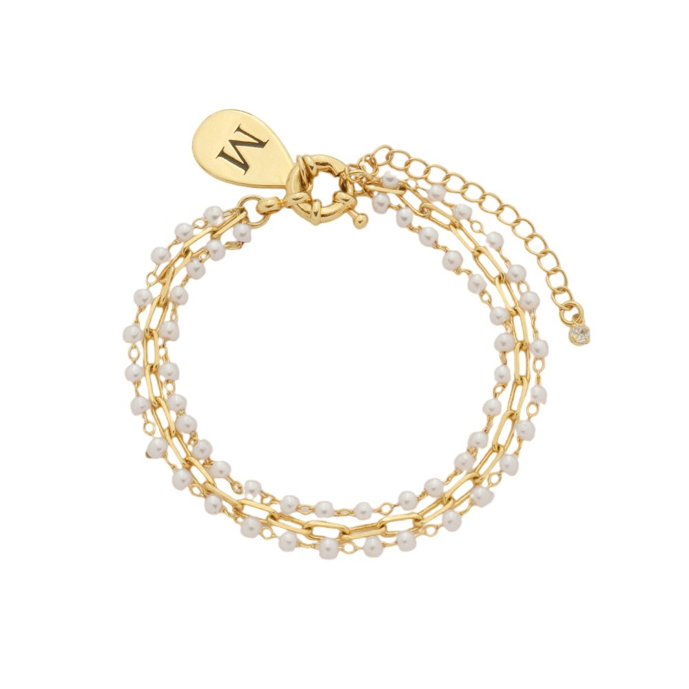 A Pulseira Multicamadas com Pérolas une correntes douradas em diferentes texturas com pequenas pérolas delicadamente distribuídas, criando um efeito sofisticado e atemporal no pulso.