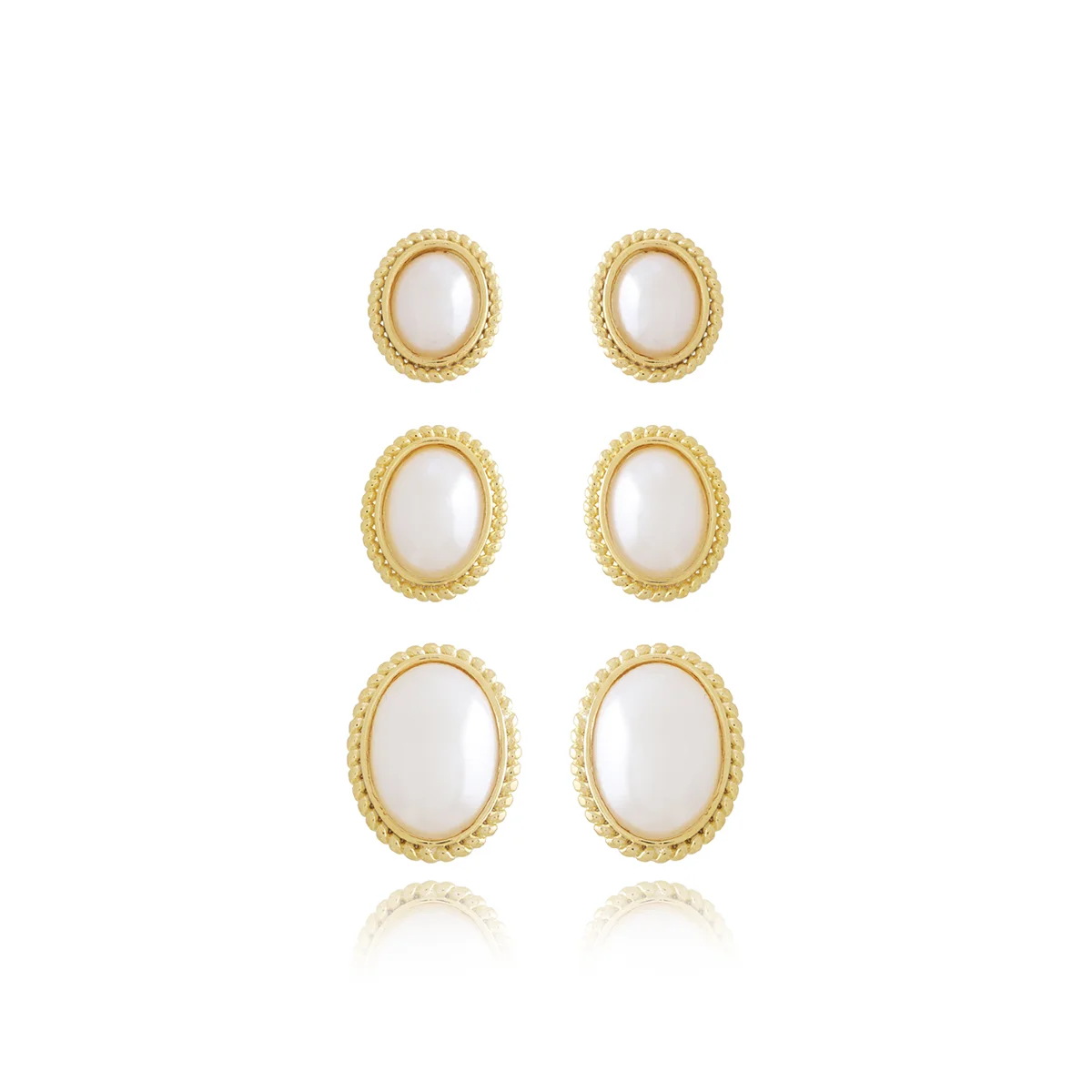 Encante-se com esse brinco! Este lindo TRIO DE PÉROLAS OVAL é feito com LATÃO BANHADO A OURO 18K de alta qualidade. Características: •Material: Latão •Banho: Ouro 18k •Peso: 13 g •Cor: Montblanc